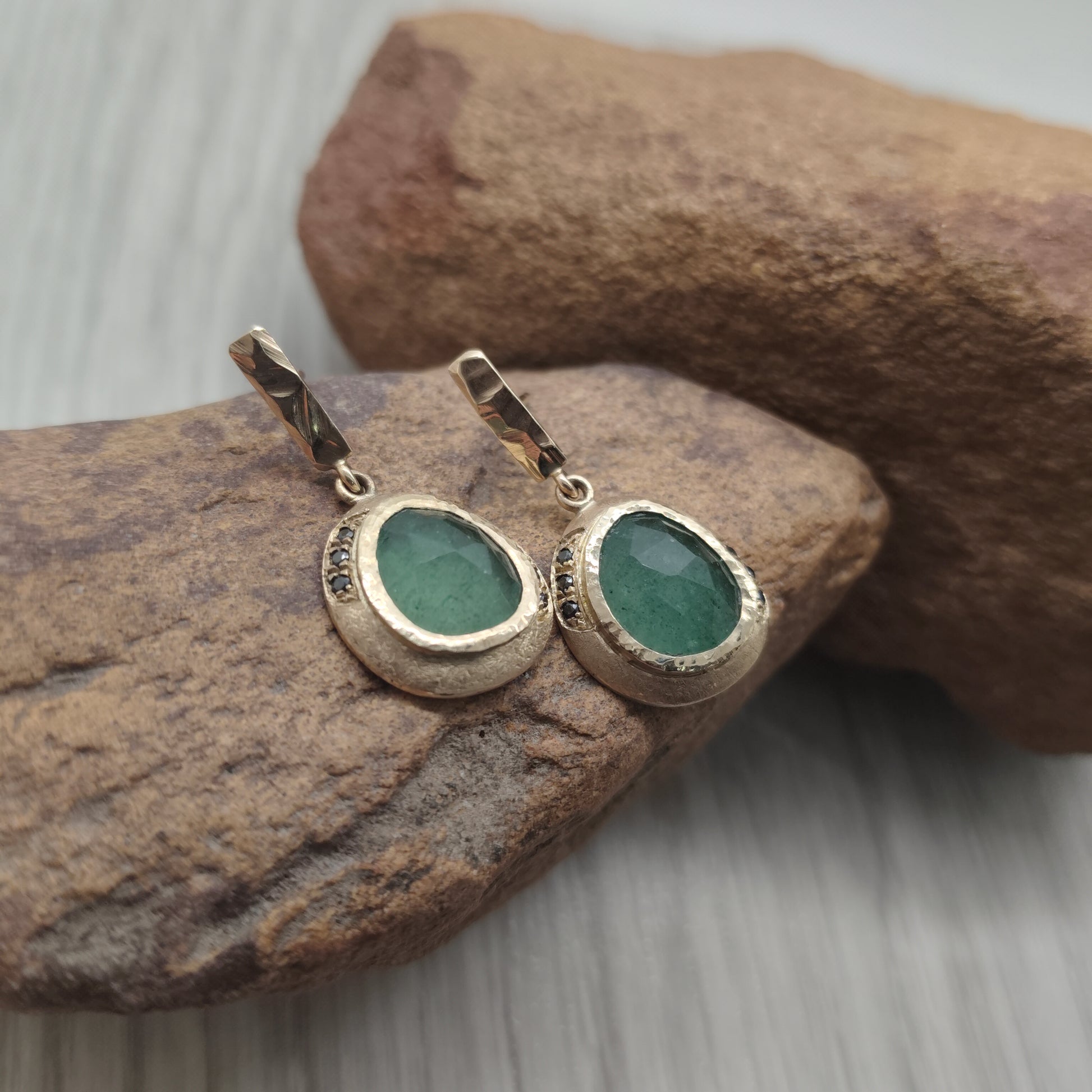 Aventurine & Black Moissanite Drop Earrings in Textured 9ct Gold