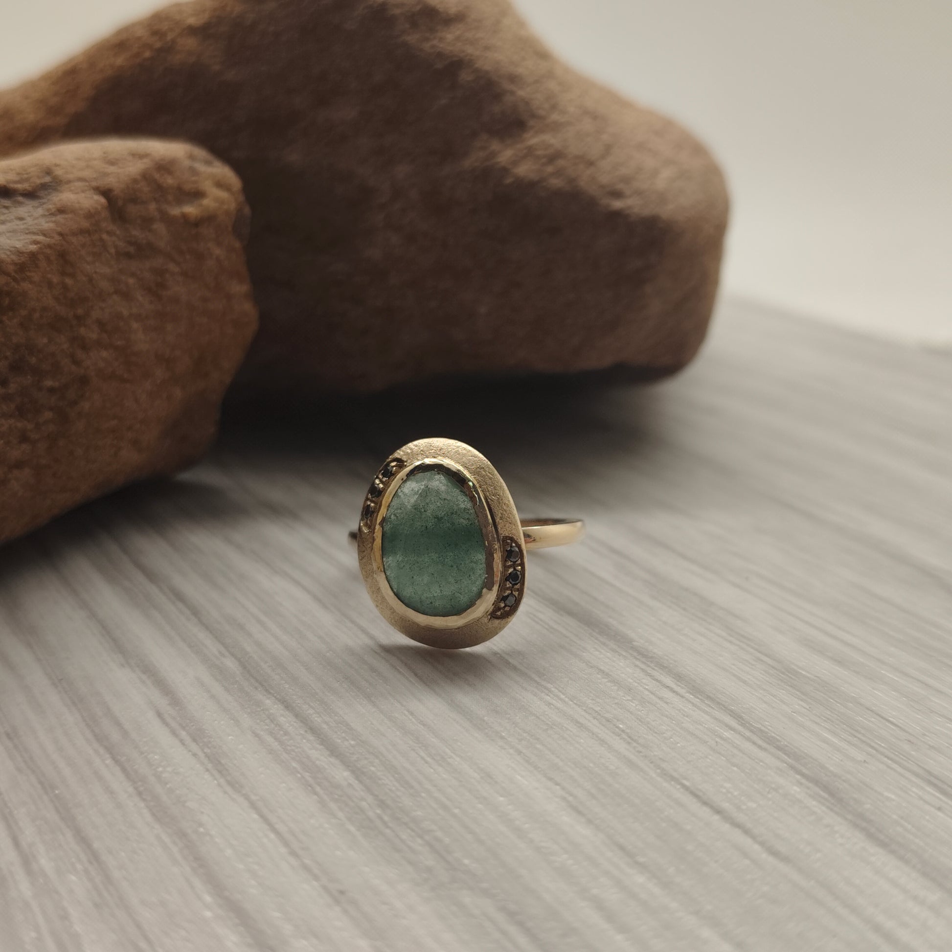 A statement of quiet strength. This bold flat-cut aventurine is cradled in hand-textured 9ct yellow gold and accented by small black moissanites — a subtle spark set against a sea of green. The contrast is striking, the form distinctive, the feel effortlessly wearable. A piece to ground you and elevate the everyday.