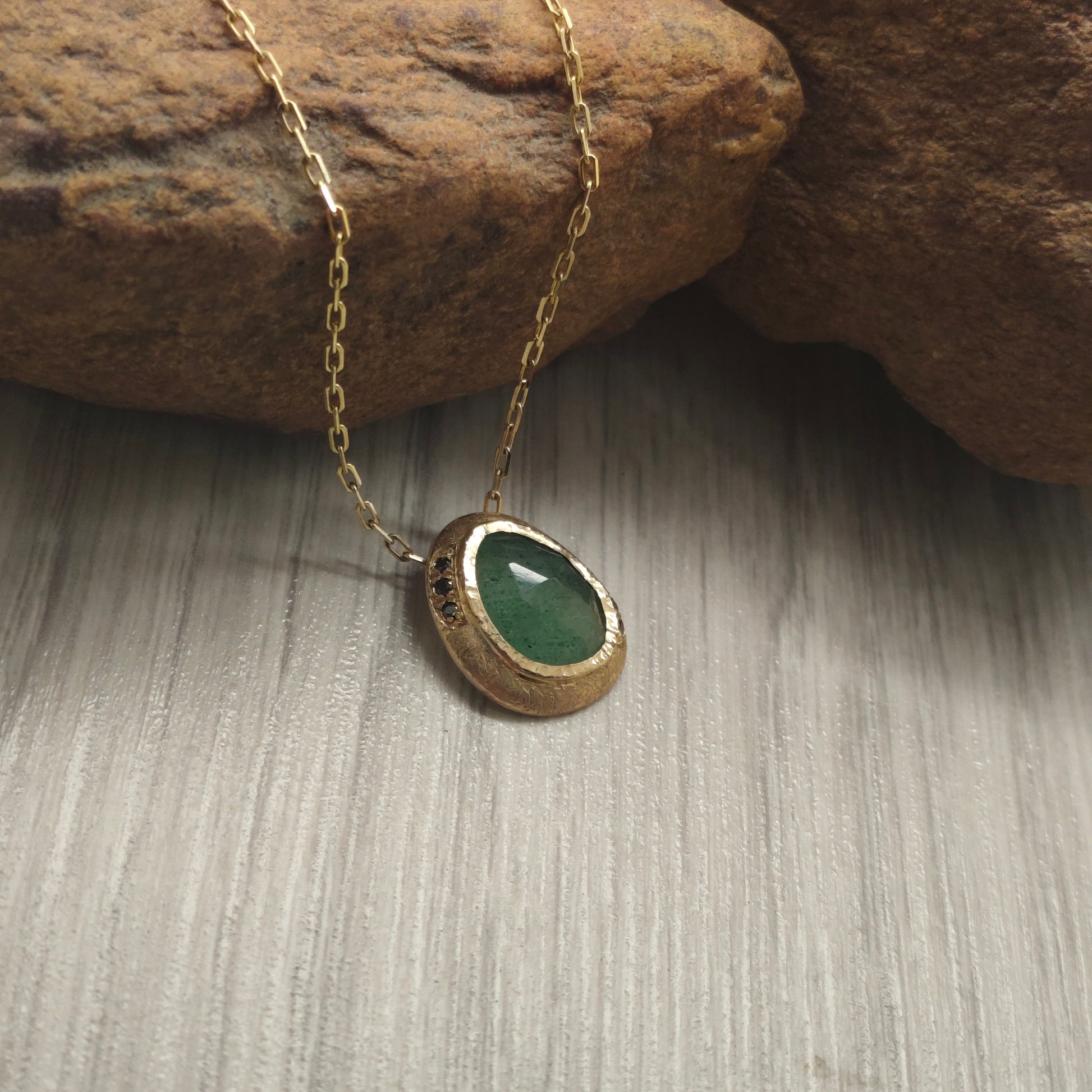 This pendant pairs the raw beauty of flat-cut aventurine with the quiet brilliance of a single black moissanite. Set in richly textured 9ct yellow gold and suspended from a fine chain, it’s a piece that speaks softly but leaves a lasting impression. Wear alone or layered — always personal, always poised.
