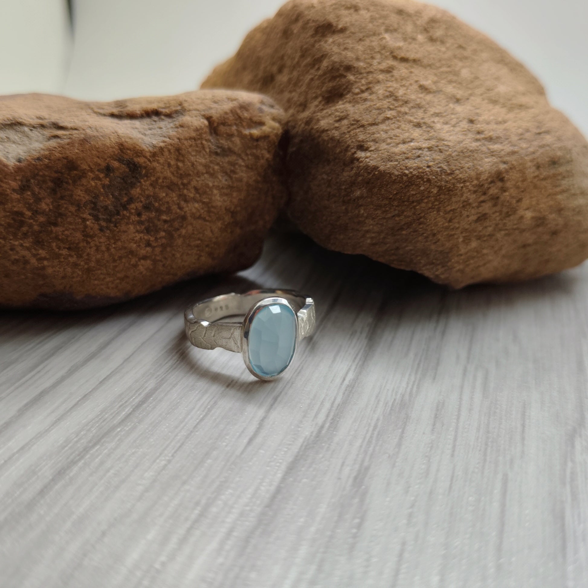 Soft in hue, strong in presence. This flat-cut chalcedony ring is set in textured sterling silver — a cool contrast that reflects quiet confidence. Its fluid form and subtle stone make it a signature piece for everyday wear, with a calm elegance that endures.