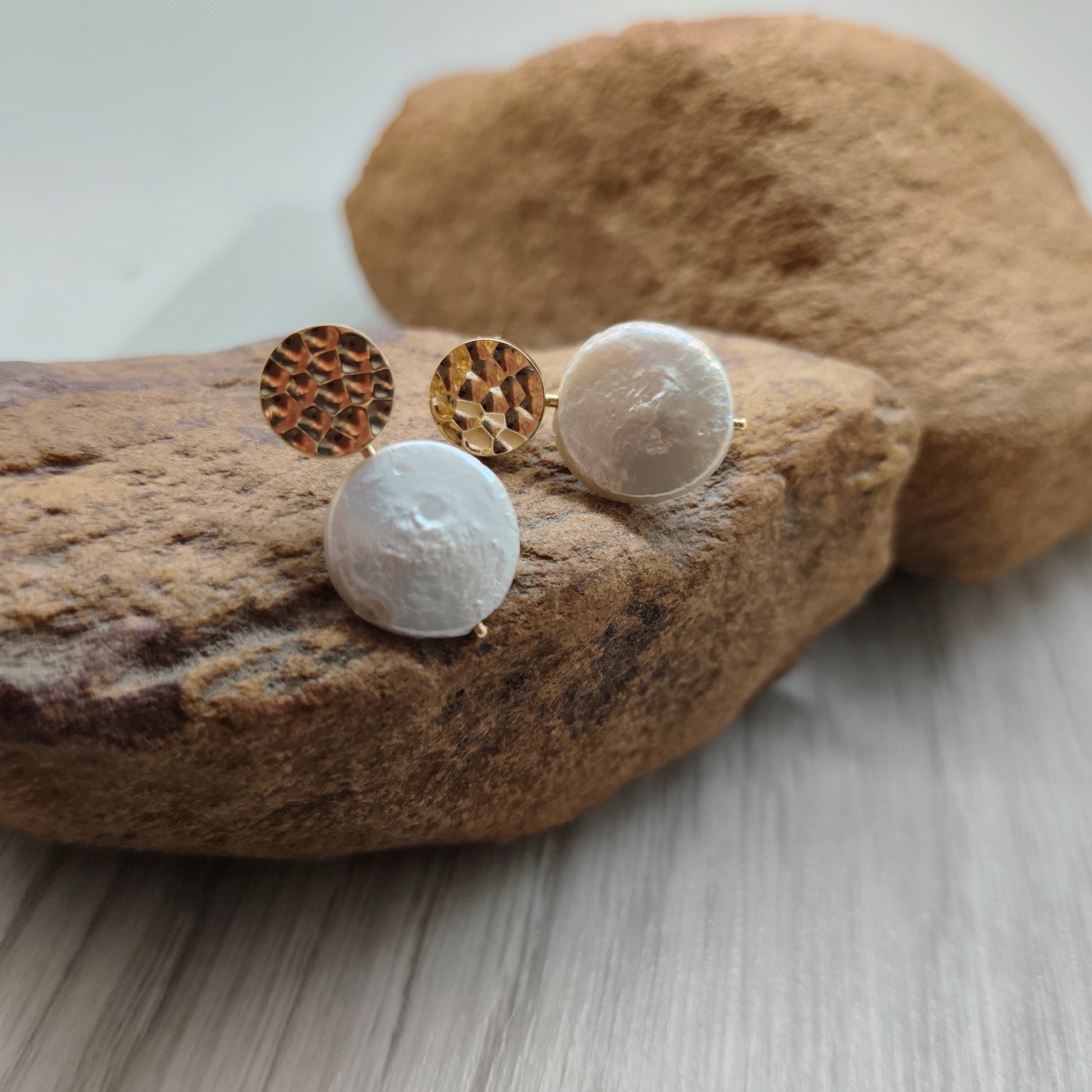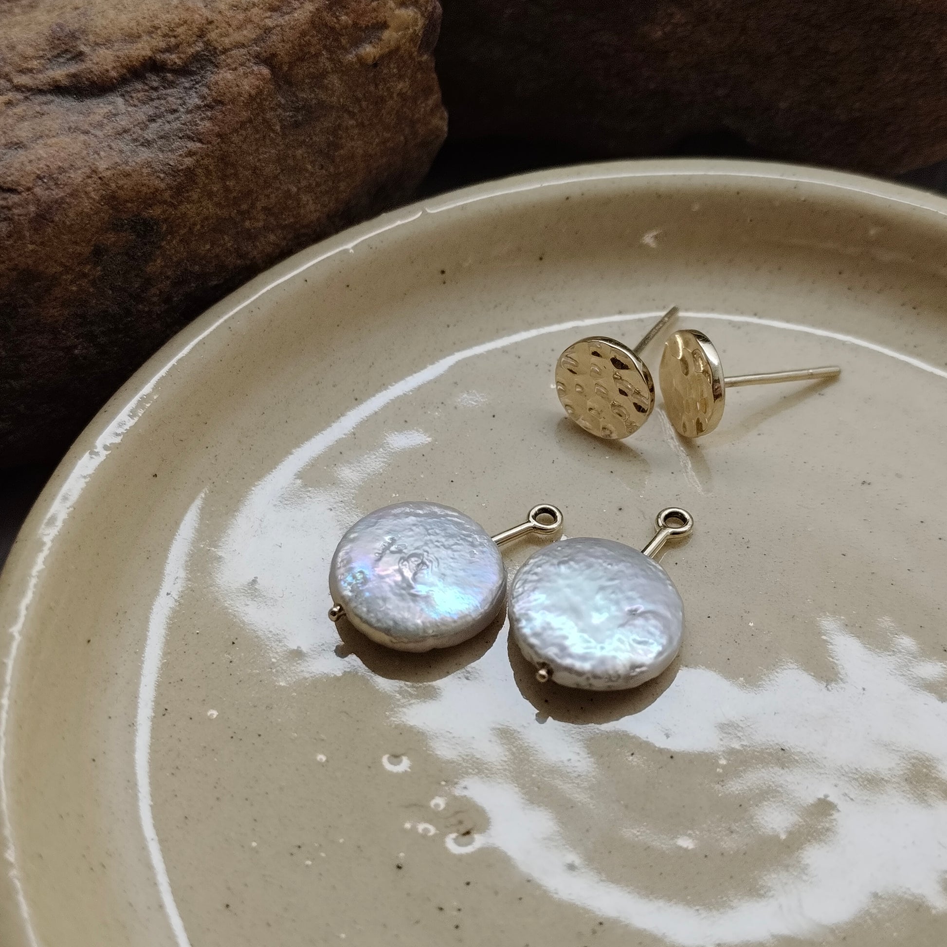 Timeless with a modern edge. These coin pearl drops feature soft, natural lustre and a distinctive flat profile, offering a fresh take on classic pearl jewellery. Designed to pair effortlessly with our hammered gold disc studs, they bring subtle movement and organic elegance to your modular earring set. A quietly luxurious choice for day or evening wear.