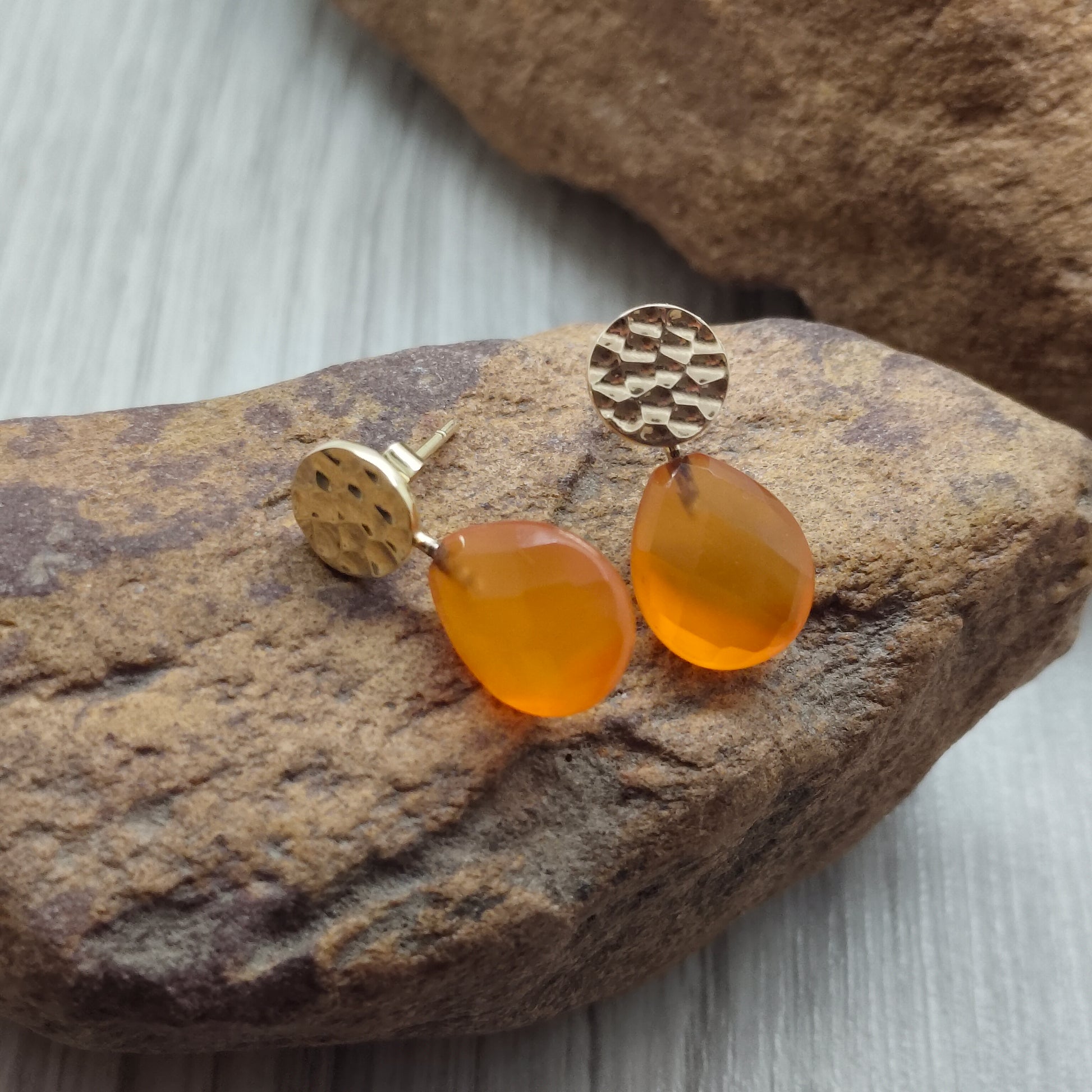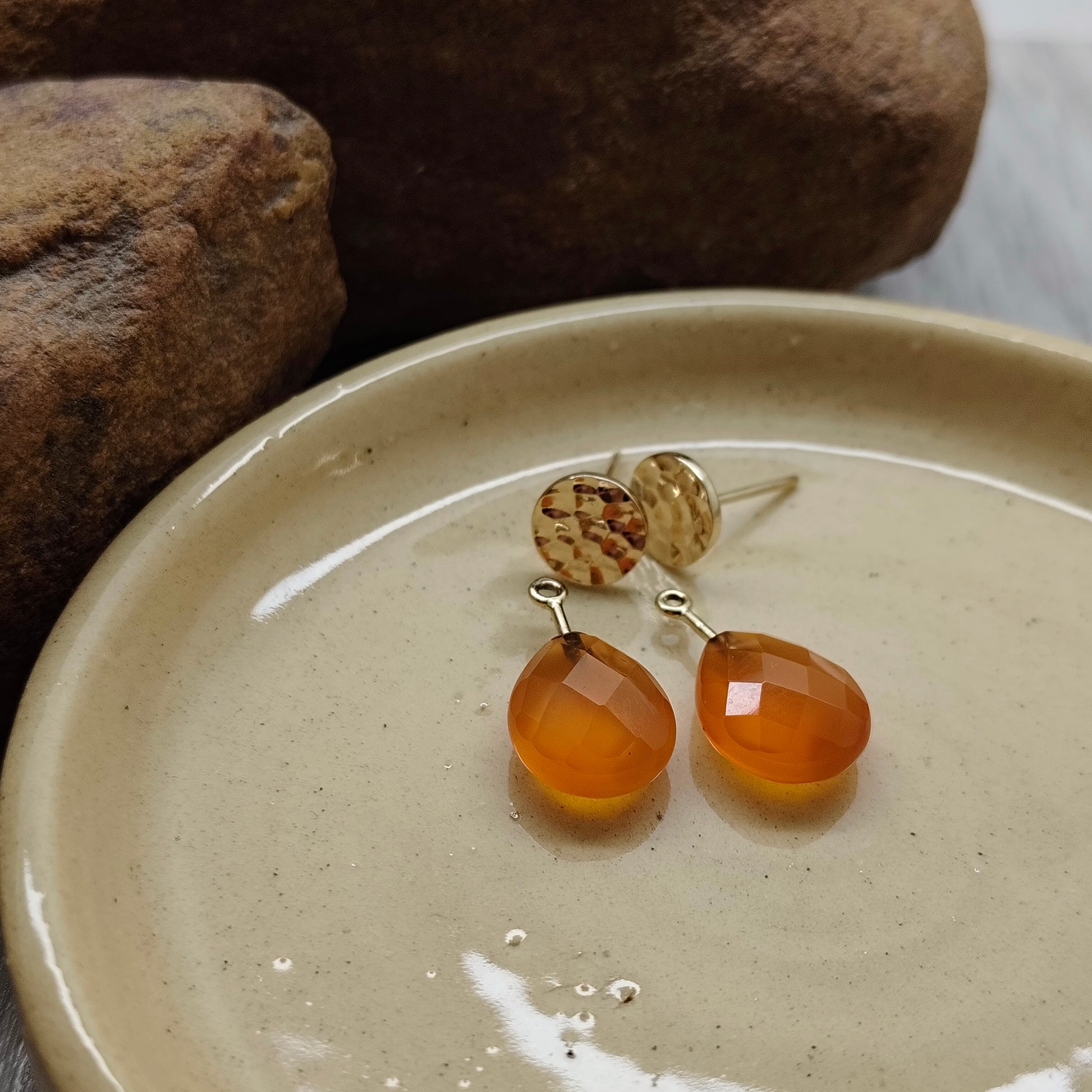 A warm, vibrant accent for your everyday studs. These faceted carnelian drops are cut in a classic briolette shape to catch and reflect the light, revealing rich burnt orange tones. Designed to attach seamlessly to our hammered gold disc studs, they add colour, movement, and character — an easy way to personalise your look.