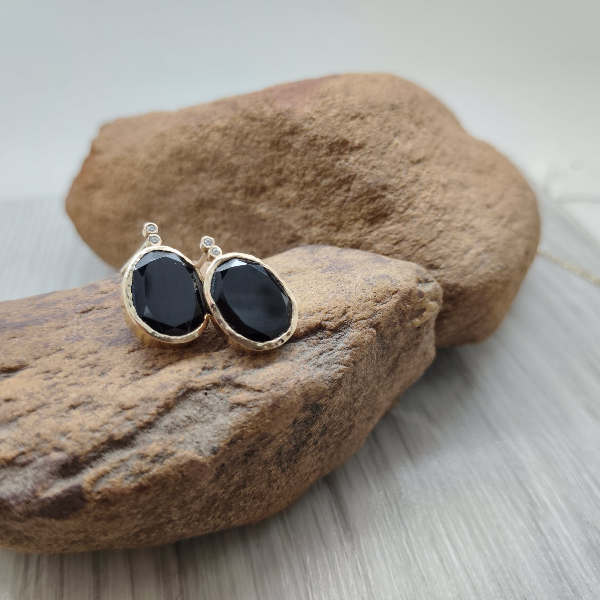 Flat Cut Black Spinel Earrings with Diamond Accents in 9ct Gold