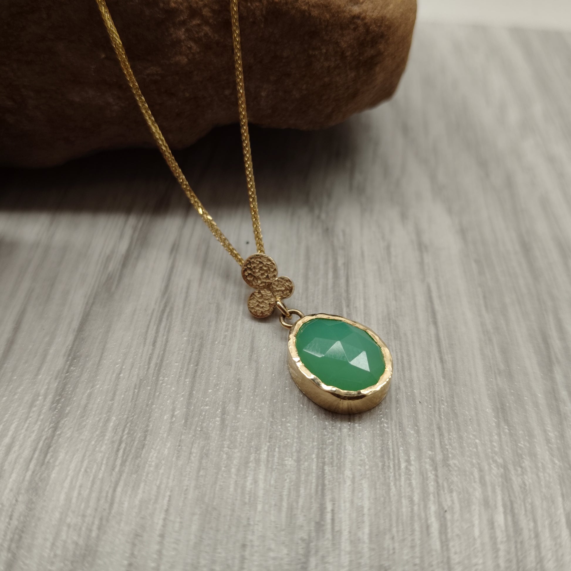 This pendant showcases a luminous flat cut chrysoprase, bezel-set in richly textured 9ct yellow gold. The gentle green of the stone contrasts beautifully with the warmth of the gold, while the artisanal texture adds a layer of quiet individuality. Suspended on a fine gold chain, this piece offers refined colour and softness in a timeless silhouette.