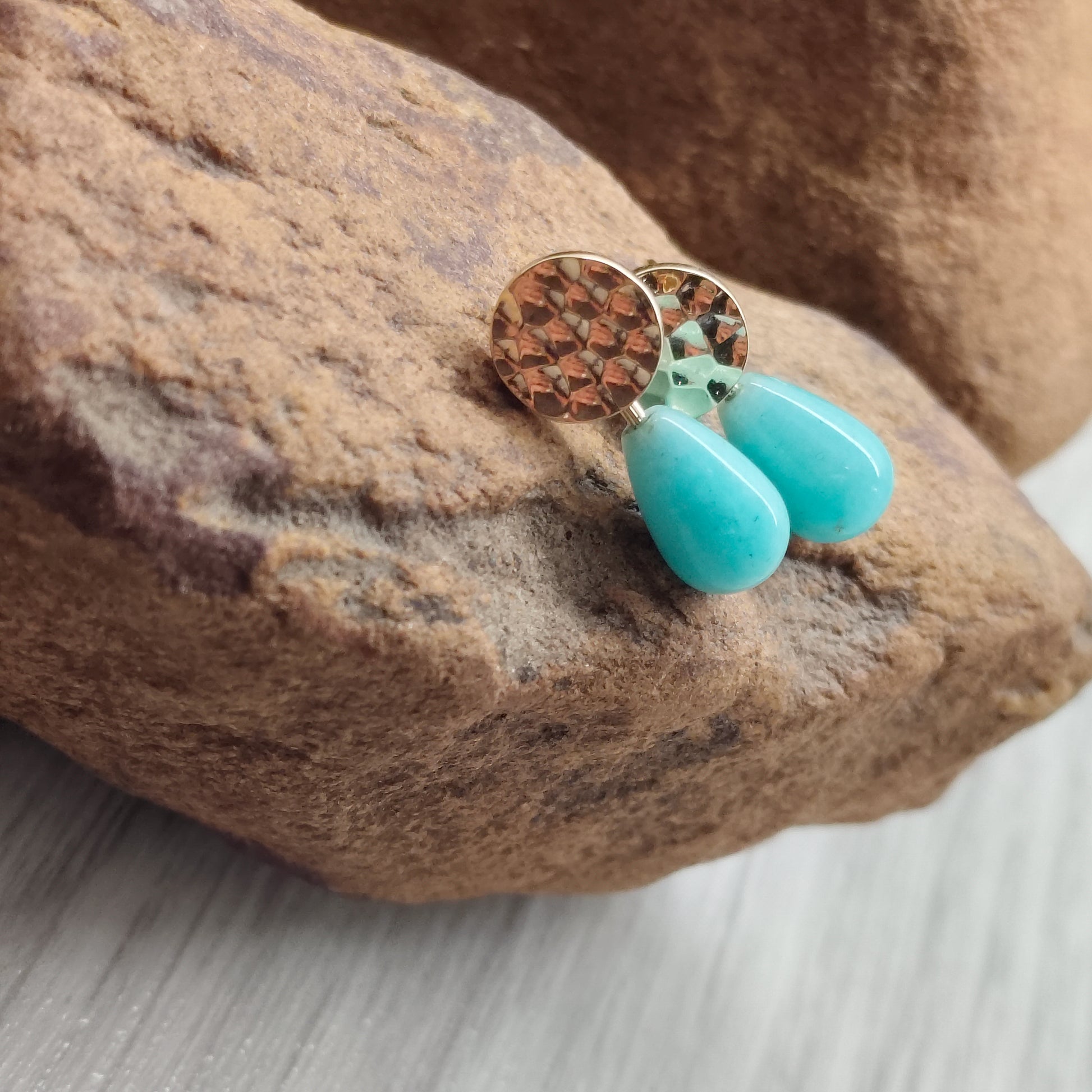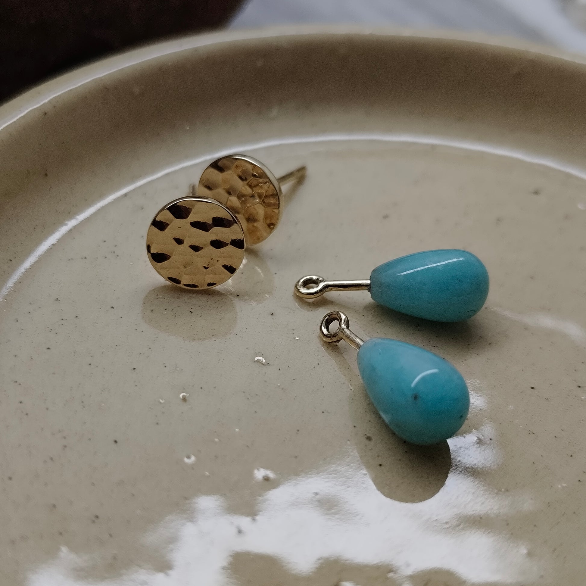 Soft, serene, and easy to wear. These polished amazonite drops bring a gentle pop of colour in calming sea-green tones. With a smooth finish and rounded silhouette, they’re designed to hang effortlessly from our hammered gold disc studs. Subtle movement and fresh colour make them a go-to choice for effortless, everyday versatility.
